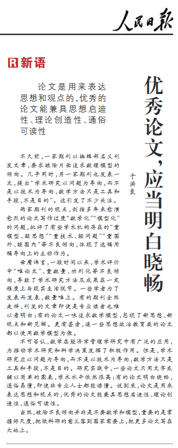 两家期刊的观点,剑指多年来愈演愈烈的论文写作过度“数学化”“模型化”的问题,批评了有些学术机构存在的“重模型、轻思想”“重技术、轻问题”“重国外、轻国内”等不良倾向,体现了选稿用稿导向上的主动作为。