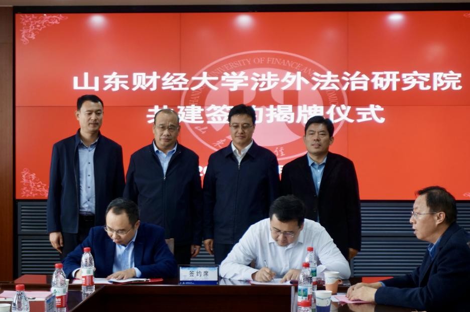 法学院院长张琳、自贸试验区济南片区济南高新部部长段连文签署《山东财经大学涉外法治研究院共建合作协议书》。