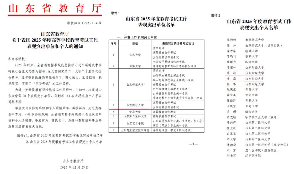 近日,山东省教育厅发文对在2025年度高等学校教育考试工作中表现突出的单位和个人进行通报表扬。我校凭借在高等教育自学考试和全国计算机等级考试评卷工作中的突出表现,荣获“山东省2025年度教育考试工作表现突出单位”荣誉称号。李宗林、陈萌、李磊、郭军荣获“山东省2025年度教育考试工作表现突出个人”荣誉称号。这是我校继获得山东省教育考试优秀考点、优秀评卷点、优秀研究生招生考试自命题单位、山东省教育考试工作表现突出单位后再次获得的殊荣。