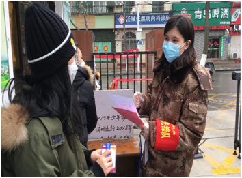 面对困难危险,她无所畏惧。社区疫情防控一线,人员众多,向居民宣传防疫知识、组织外来人员填写信息登记、协助网格员签订承诺书、为居民办理发放出入证、为出入社区的居民测量体温等等,都需要与群众近距离接触,她从未畏惧,到处都有她忙碌的身影,为社区工作人员分担了压力,得到了“战友”们的充分认可。