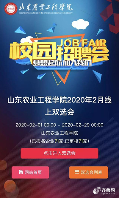 济南大学举办“2020届毕业生春季网络招聘会”,鼓励用人单位采用在线笔试,利用微信、QQ等即时通讯工具进行视频面试等方式开展对毕业生的考察遴选工作。