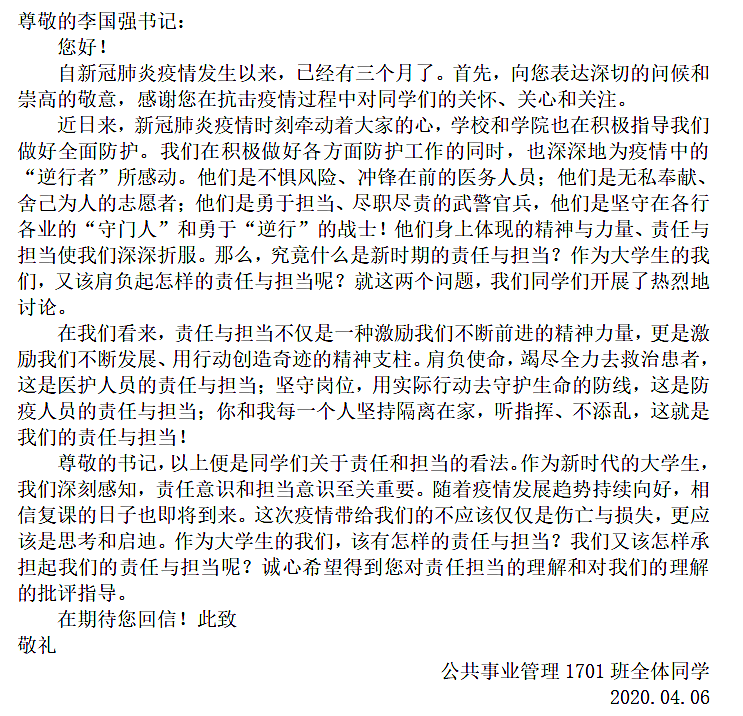 近日,公共事业管理1701班全体同学致信公共管理学院党委书记李国强。信中谈到,他们为疫情发生以来一批批勇敢“逆行者”的忘我精神深深感动,并对在新的时代背景下,青年应当肩负的使命产生了很多的思考,希望得到李书记的指点和帮助。接到信后,李国强书记用“青年人的责任与担当”为题,给同学们寄出了一封言辞诚恳的回信,在同学中引起了热烈反响。