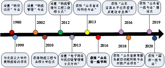 该专业是山东省最早开设的物流管理专业之一,发展历史可以追溯到1980年就开设的物资经济专业,2001年开设了中荷物流管理实验班,2002年开设物流管理专业,2013年被评为山东省高等学校本科特色专业,2016年被评为山东省高水平应用专业群(信息管理与信息系统,物流管理,电子商务,管理科学)。2018年成功申请教育服务新旧动能转换专业对接产业项目,2019年成果获批山东省一流专业建设点。