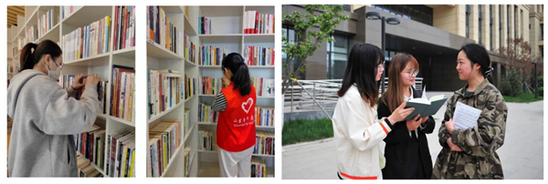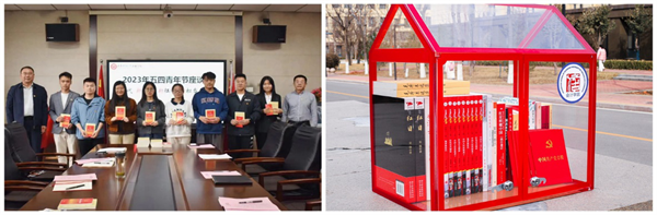 在金融学院召开的五四青年节座谈会上,师生代表获赠《习近平新时代中国特色社会主义思想学习纲要》《党的二十大文件汇编》。“信任、共享、传递”,会计学院在圣井校区设立的以红白为主体、外形酷似房屋的“鸟巢图书馆”,以“一本书多人读,一人读多本书”为宗旨,通过“借一本书,放一本书”的诚信借阅原则,使有限的图书在校园流动起来。