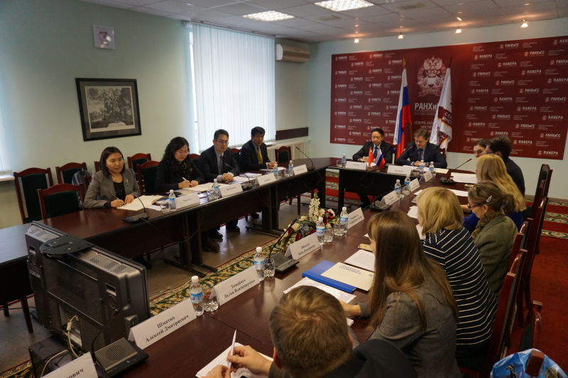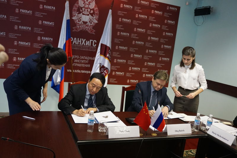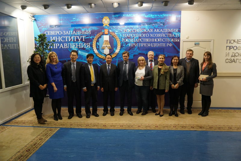 在俄罗斯期间,代表团还访问了俄罗斯总统直属国家经济与公共管理学院西北管理学院(RANEPA)。该校执行校长Oleg Bedrik带领副校长Evgeniy Kitin、国际合作处处长Natalya Muyzinik和副处长Evgeniya Chernyavskaya,及国际关系学院、经济学院、经济学科教育项目、管理学科教育项目负责人及教师11人参加了会谈。双方就科研、科教、创新、咨询、教学及其他事务方面的合作等进行了充分的交流,达成了一致,并签署了合作意向书。主要内容包括:(1)双方加强专业经验交流,促进掌握在管理、人文科学和社会经济科学方面的现代科学方法和杰出实践;(2)双方特别重视创新和提高科研水平和质量,鼓励并支持以共同创新工作为导向的各类创新活动;(3)共同组织开展科学实践活动(论坛、会议、研讨、进修、夏令营等)、共同开展科学研究;(4)开展和引进具有竞争力的新教学理念,培养高水平硕士、博士;(5)进行教师、专家、青年学者、大学生交换;此外还包括加强科学信息和科学出版物交换、组建共同的科研中心和实验室、共同出版科学和研究资料、传递科学知识和经验等等。