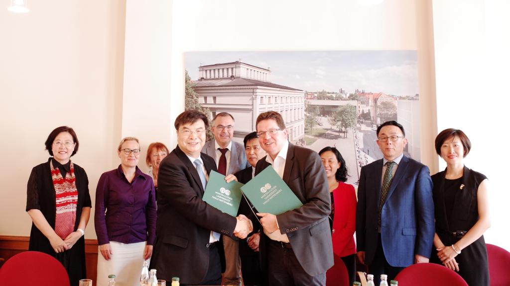 在哈勒大学,校长Christian Tietje和前副校长Gesine Foljanty-Jost等共计6人参加了会谈。赵忠秀高度评价了哈勒大学五百多年的悠久历史和国立综合性研究型大学的国际声誉,介绍了我校近况及国际化需求,希望两校开展全面合作。外国语学院与哈勒大学就德语专业联合培养、合作模式、学分互认等达成初步意向,研究生院就博士研究生联合培养、博士和硕士研究生课程、科研研修、师资派送等达成合作意向,科研处就教师学术交流、互访、联合研究等进行了探讨。赵忠秀与Christian Tietje共同签署了两校合作备忘录。按照惯例,哈勒大学与国际伙伴合作一般要经历3个实际合作项目以上才能签署两校合作备忘录,我校首次出访即签署备忘录,得益于对外经贸大学前期多年合作搭建的良好基础。