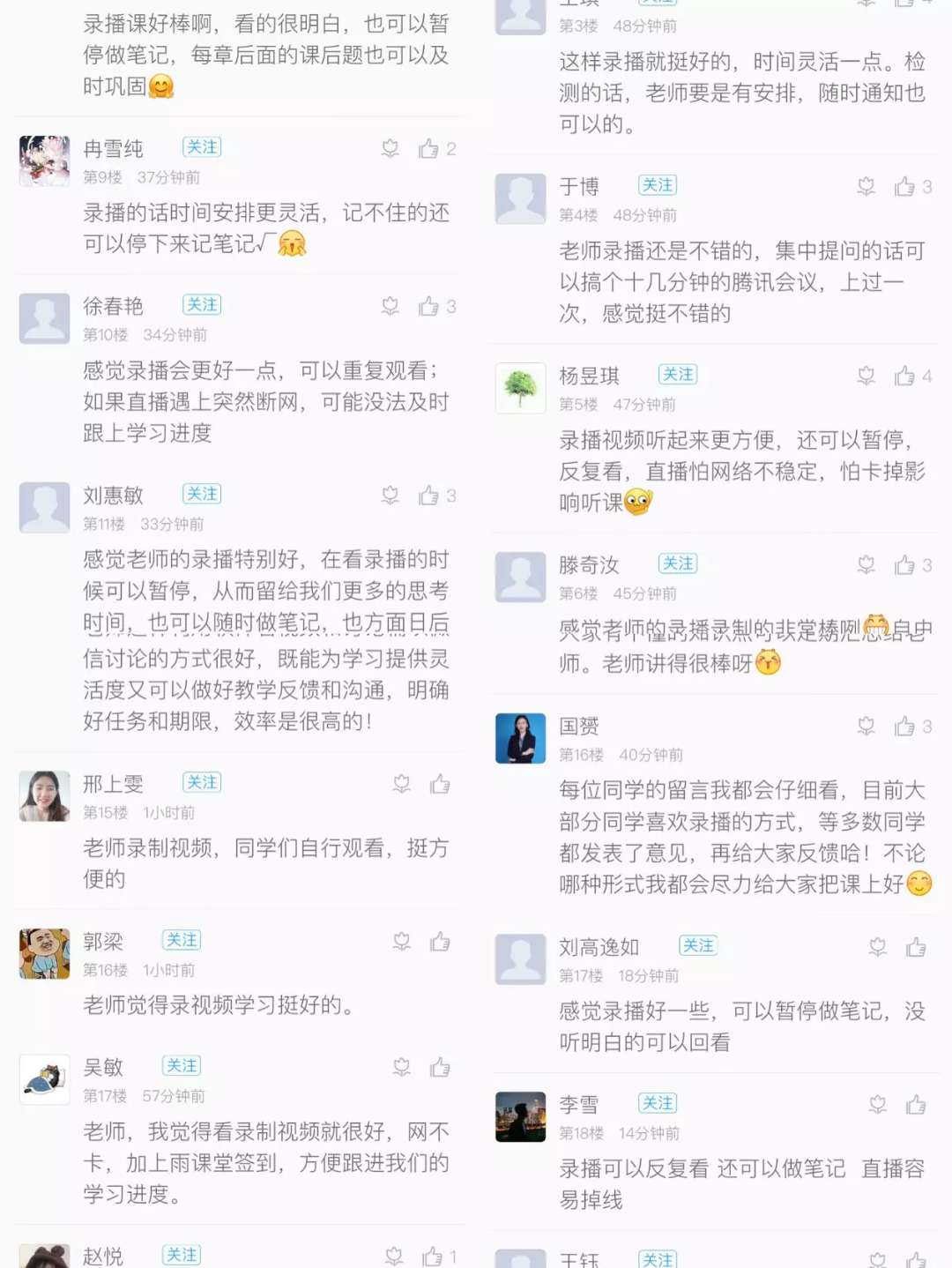 目前,学校教学秩序平稳,老师们操作授课平台驾轻就熟,讲解优质课程资源深入浅出,师生课堂互动气氛热烈,在线讨论、答疑和检测等多种教学形式相辅相成,教学质量得到了有效保证。