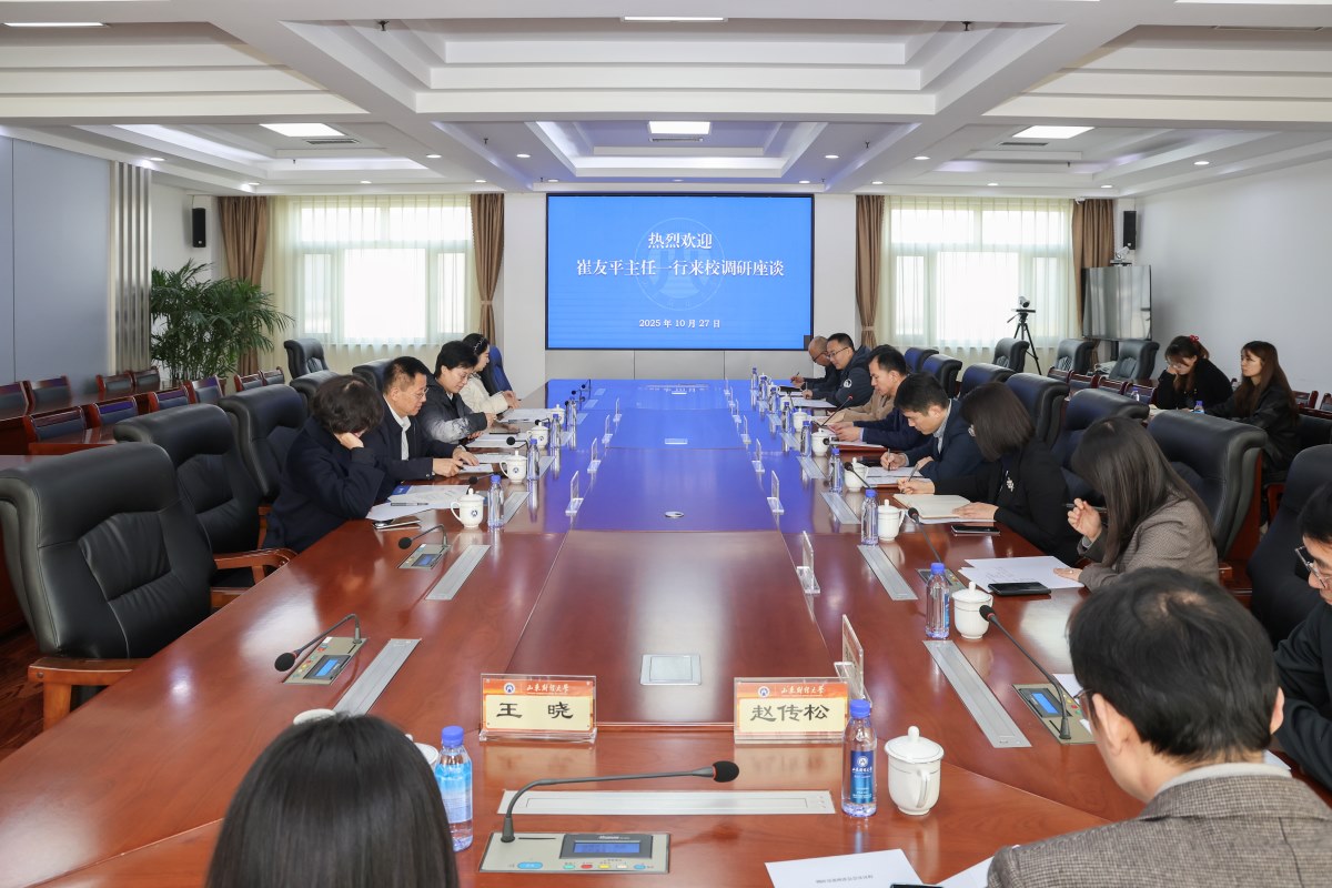 查玉喜代表学校对崔友平一行表示热烈欢迎,对崔友平同志在山东财经大学工作20多年期间做出的贡献表示感谢。并介绍了学校近期在校史溯源、学科专业建设和人才培养等方面取得的新进展与新成效。希望以此次调研为契机,与中央党史和文献研究院在马克思主义理论学科建设、中国自主知识体系建构等领域深化合作,共同服务国家重大战略与哲学社会科学发展。