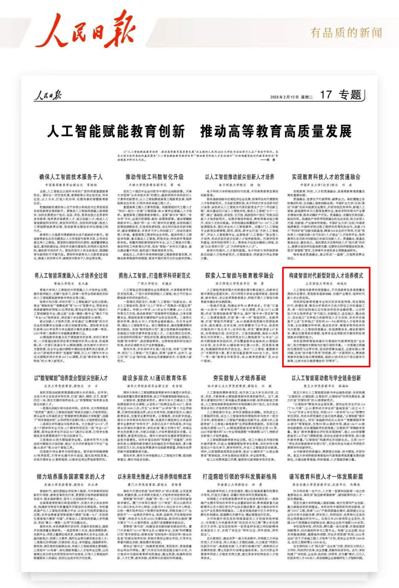 2月10日,《人民日报》编发校长洪俊杰在“人民网2025大学校长论坛”上的发言——“构建智能时代新型财经人才培养模式”,内容如下: