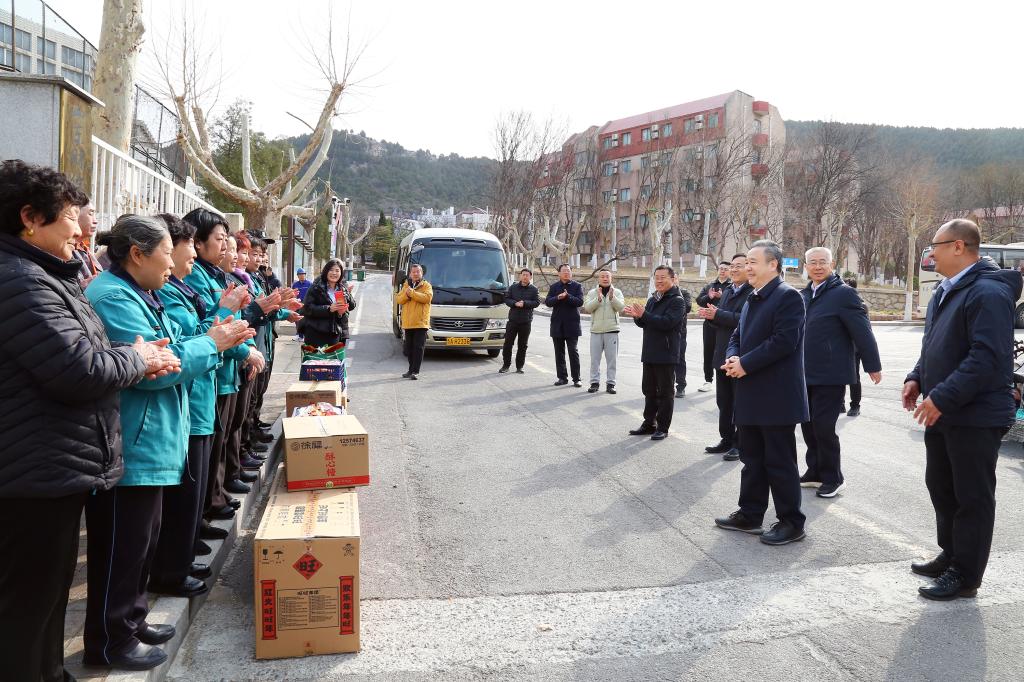 在燕山校区校门、1号教学楼和舜耕校区校门、物业服务中心,每到一处,查玉喜都与在岗安保和物业工作人员亲切交谈,了解他们的工作和生活安排,代表学校对他们过去一年的辛勤付出和节日里舍小家、顾大家的敬业奉献精神表示衷心感谢,送上慰问品、慰问金,并祝愿大家身体健康、工作顺利、阖家幸福安康。