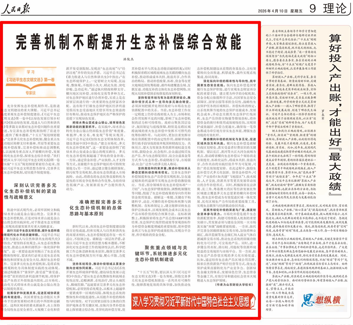 4月10日,《人民日报》第九版“深入学习贯彻习近平新时代中国特色社会主义思想·学习《习近平生态文明文选》第一卷专家谈”专栏刊发校长洪俊杰的理论文章“完善机制不断提升生态补偿综合效能”,全文如下: