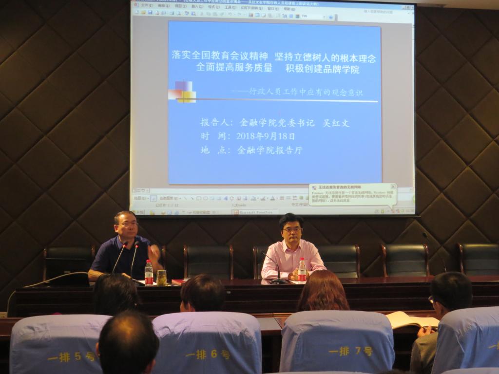 9月18日下午,金融学院举办行政人员工作能力提升培训班。学院党委书记吴红文、院长彭红枫主讲,学院18个党支部书记,行政办公室、学生工作办公室全体人员,学生会、研究生会主要学生干部参加了培训。