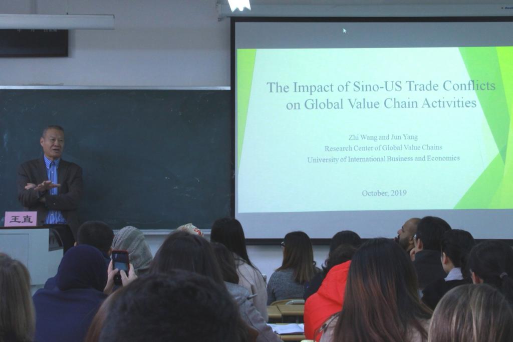 11月13日上午,山东财经大学国际经贸学院学术论坛(2019年第6期)在舜耕校区举行。美国国际贸易委员会资深国际经济学家、对外经济贸易大学全球价值链研究院海外院长王直教授应国际经贸学院邀请作The Impact of Sino-US Trade Conflicts on Global Value Chain Activities主题报告。