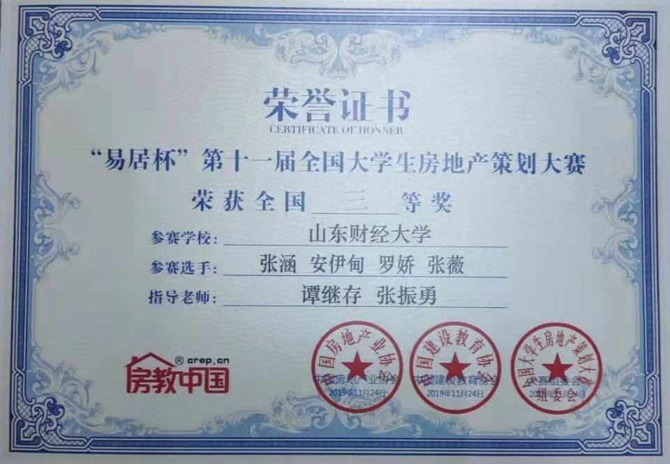 大赛共分为华北、西北、华东、西南、华中、华南、东北七大区域进行比赛,我校代表队成员张涵、张薇、安伊甸、罗娇在指导老师谭继存、张振勇的带领下,历经131天,进行了三次实地调研,对项目周边五个竞品多次踩盘,发起问卷调查,参考了诸如国家统计年鉴、楼栋布局与地域分析等文献资料,询问过多位在职房产策划的意见,几经起稿、多次翻新,实事求是的完成了项目策划书和展示ppt,并在十月通过华北赛区区域赛入围全国总决赛。