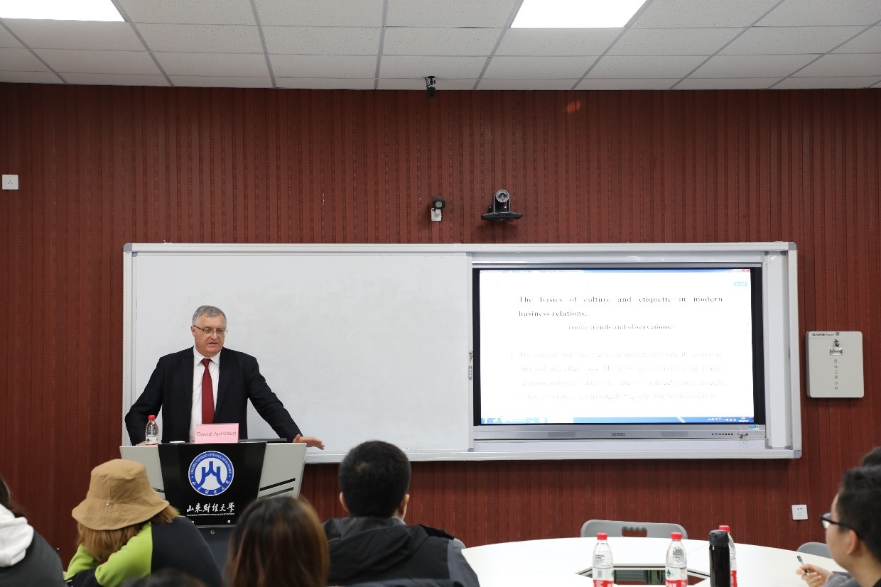 12月2日,格鲁吉亚前驻华大使大卫•阿普恰乌利(David Aptsiauri)先生应国际经贸学院邀访问我校,分别到圣井校区为国际发展合作本科创新实验班和舜耕校区为研究生创新实验班的同学进行专题授课。本科创新实验班的授课主题是The basics of culture and etiquette in modern business relations,研究生创新实验班的授课主题是One Belt-One Road as a new model of global economic cooperation,阿普恰乌利用幽默生动的语言向同学们介绍了现代商务洽谈中的礼仪和文化差异问题,并基于我国“一带一路”倡议背景,阐述了当今国际经济合作关系的发展演变历程,受到了同学们的热烈欢迎。