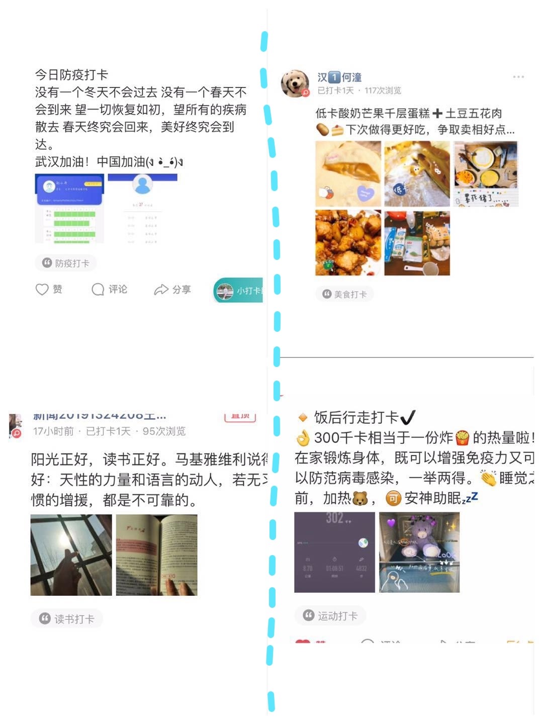此次打卡活动共有七大模块:防疫打卡、学习打卡、文学创作打卡、读书打卡、美食打卡、运动打卡、其他类型打卡。在防疫打卡中,同学们纷纷晒出"区块链疫情监测系统"的打卡情况、居家消毒、戴口罩的场景,展现了自我防疫的热情与保护自己、保护他人的决心;在学习打卡中,我们能感受到同学们上网课、背单词、学语言、备考计算机二级的认真状态,“停课不停学”的热情感染着每个人;在其他模块中,同学们更是将自己阅读的感悟、制作的美食、创作的小说及影评等原创内容进行了分享与交流。此外,我们不仅领略到了新疆早上八点半的天空、黑龙江独特的雪景,还欣赏了隽永洒脱的书法作品、美妙动听的吉他弹奏,可谓各领风骚,令人大饱眼福。