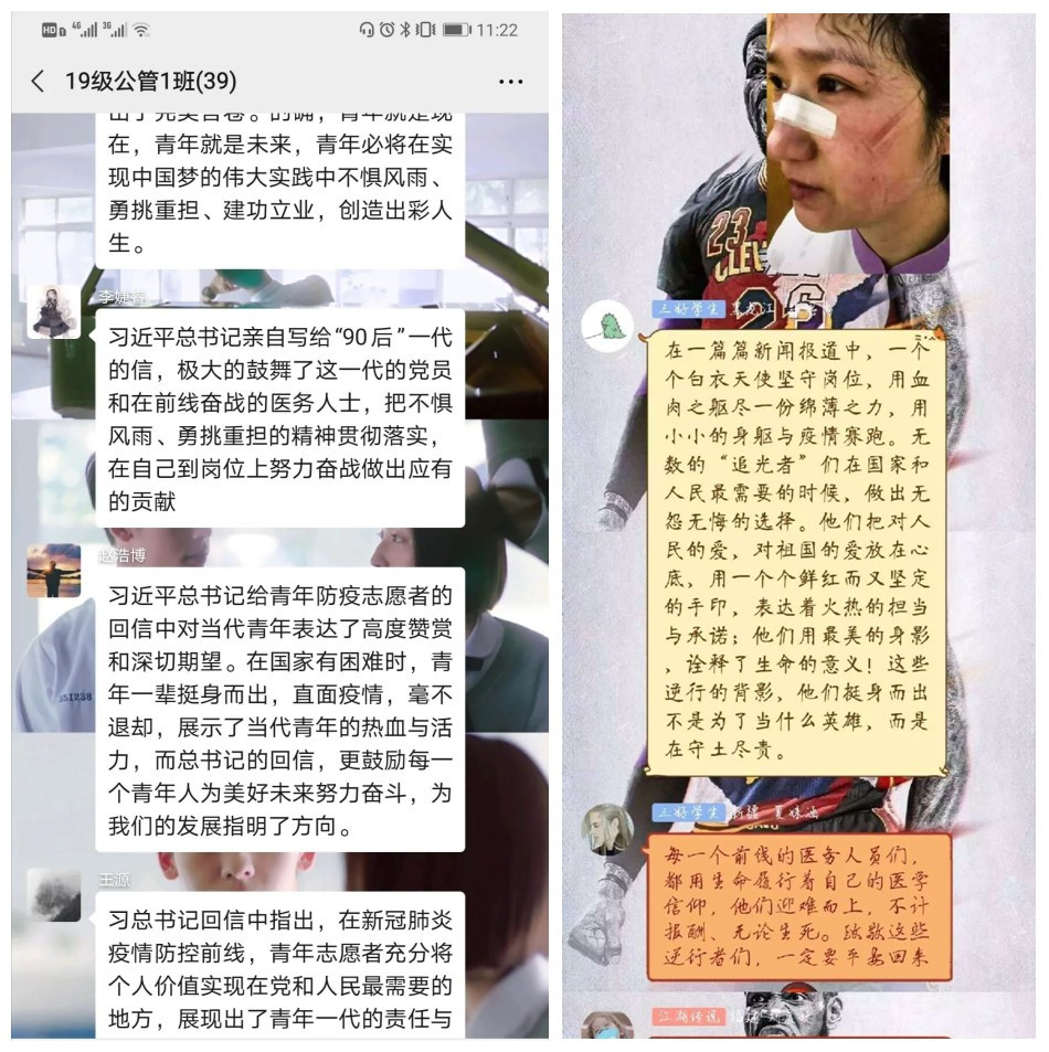 学习新思想,争做新青年。3月27-28日,公共管理学院举办了“青年大学习”线上主题团课大讨论活动,各团支部以“不惧风雨、勇挑重担”“当代青年要勠力同心,同心抗疫”“疫情防控阻击战最美逆行者”“青年有理想、有担当,民族就有希望”等为主题,展开精彩纷呈的线上讨论,通过网络平台交流体会,传递感悟。