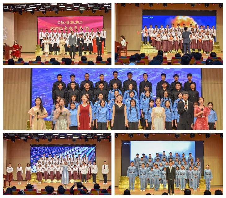 活动伊始,金融学院融光合唱团带来的歌曲《保卫黄河》拉开了整场活动的序幕,全场气氛活跃。各班按照抽签顺序依次上台表演。同学们衣着整齐,极具特色,有重回历史的民国风服饰,有致敬往昔的军装,还有整齐庄重的西装领结,展现出积极向上的精神风貌。比赛中,同学们各展风采,或重温经典唱起《我的祖国》、《国家》等歌曲,用真挚赤子之心歌颂祖国的大好河山;或唱起《渴望光荣》等歌曲,用热血激昂的谱曲书写青春最美的华章;还有的班级唱起《英雄进行曲》,掷地有声的朗诵,配以气势磅礴的军号,为舍身报国的英雄们献上赞歌……各班级表演结束后,金融学院艺术团带来了抗疫经典节目《山河应无恙,吾辈当自强》,极具中国风的舞蹈与悦耳的歌声互相碰撞,在观众雷鸣般的掌声中将现场气氛推向高潮。活动最后,融光合唱团带来歌曲《我和我的祖国》,引起在场观众的共鸣,师生纷纷起立,挥舞红旗,齐声高唱。整场活动在全场大合唱的美妙歌声中结束,师生共同向祖国表达了最美好的祝愿。