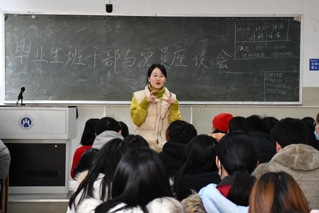 为缓解毕业生临近考试产生的紧张焦虑情绪,座谈会上辅导员老师们从今年考研形势解读切入、围绕如何树立自信心、如何调解紧张压力以及学生干部和党员如何树立集体意识和责任意识等方面与学生们展开了交流。在考研形势解读中,李珊珊分析到:今年考研人数虽较2020年的341万人增了36万,达377万之多,但2021年硕士研究生扩招规模也稳步扩大,录取几率会大大增加。扩招虽是把双刃剑,但在一定程度上确实缓解了就业压力。希望考生们在看待如此庞大的考研大军时,能放平心态,从容迎战,不要轻言放弃。张志萍在座谈中特别强调了与会学生干部和党员的责任意识和担当精神,号召同学们在毕业前各个重要时间节点发挥模范带头作用。一是做好心理疏导员。对面临就业失利和考试焦虑而引起情绪波动的同学,要树立防患意识,及时与老师沟通,同时贴心帮助该同学化解矛盾、缓解焦虑。二是做好安全监督员。考试过后放假之前的这段时间,宿舍安全和返程安全将成为学生工作的焦点。希望与会学生干部和党员以身作则,增强责任心和使命感,对宿舍内饮酒、吸烟等危害公共安全的要及时制止,对包车、打黑车等存在出行安全隐患的要给予劝导。