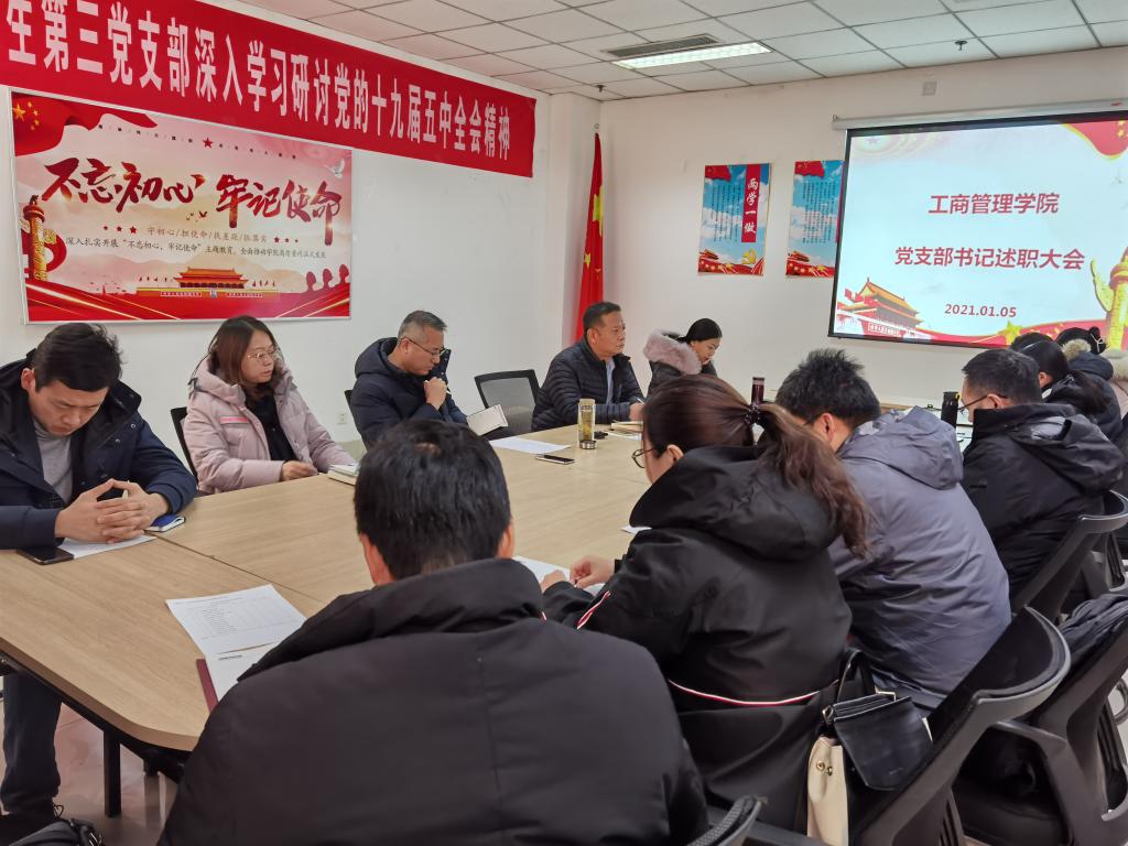 1月5日下午,工商管理学院党委2020年党支部书记述职大会在逸夫楼207举行。学院党委委员和全体党支部书记参加了本次会议,会议由党委副书记彭艳红主持。