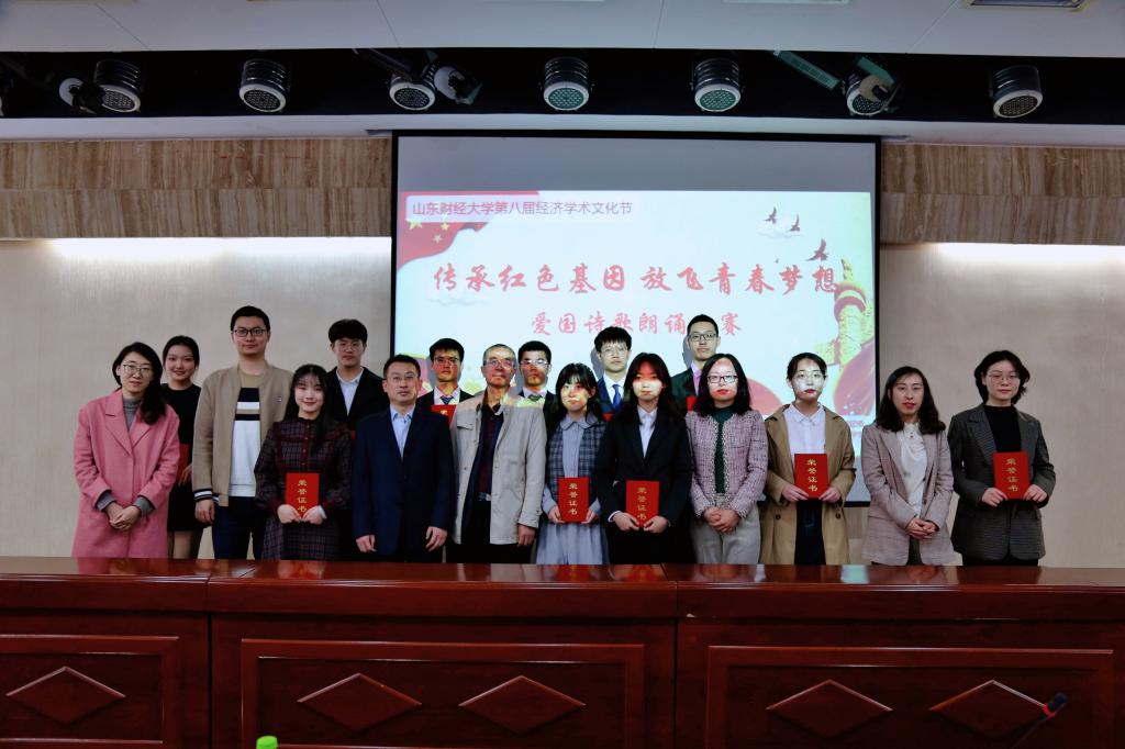 为庆祝中国共产党建党100周年, 激励学生继承和发扬党的光荣传统和优良作风。4月1日下午,校学生工作部、校团委、经济学院于圣井校区敏行楼联合举办山东财经大学第八届经济学术文化节之“传承红色基因,放飞青春梦想”爱国诗歌朗诵大赛。校党委宣传部副部长刘宝璋、校团委孙炯明老师、经济学院党委副书记高峰、李冰封担任评委,经济学院学工办主任裴斐、院团委书记付雯、院党委专职组织员王琦出席比赛,经济学院2019、2020级部分同学到场观看。