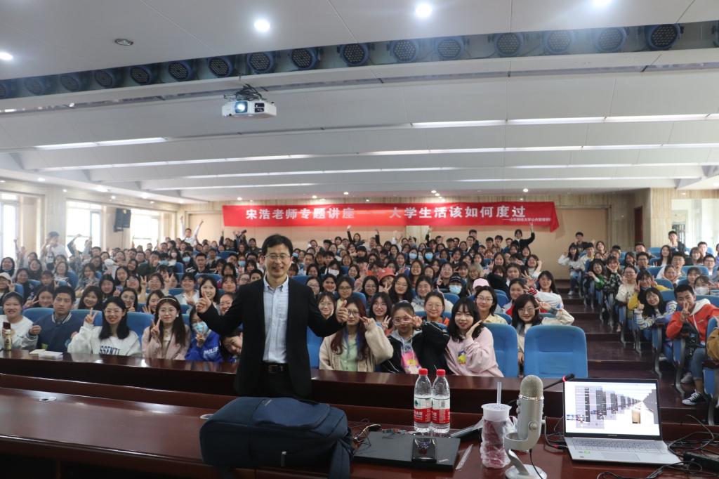 宋浩老师通过向同学们分享自己以及自己身边人的故事,配合以PPT的放映以及与同学们的互动,在愉悦的气氛中生动贴切的告诉同学们要争取把三十岁以前的时间都用来不停学习、不断深造。要相信一分耕耘一分收获,真诚努力付出就会有所回报。在大学的时光要以学业为重,做好规划,自主提升自己,使自己愈发优秀。宋浩老师说:“我们可能会用大学四年的时间来怀念高中三年,但我们会用余生来怀念大学四年”。大学生活十分珍贵美好却又转瞬即逝,在青春韶华明确方向、脚踏实地是我们不断前行的基础。
