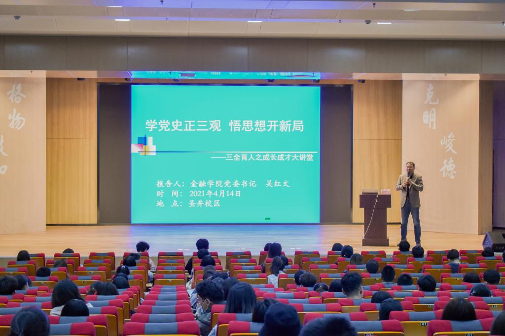 为庆祝建党100周年,深入推进党史学习教育,帮助大学生树立正确的世界观、人生观、价值观,4月14日晚,由学生处主办,金融学院承办的第292期“成长·成才”大讲堂在圣井校区文化活动中心多功能厅开讲。金融学院党委书记吴红文做了“学党史正三观,悟思想开新局”的主题报告。学校圣井校区300多名入党积极分子、学生骨干参加了此次活动。