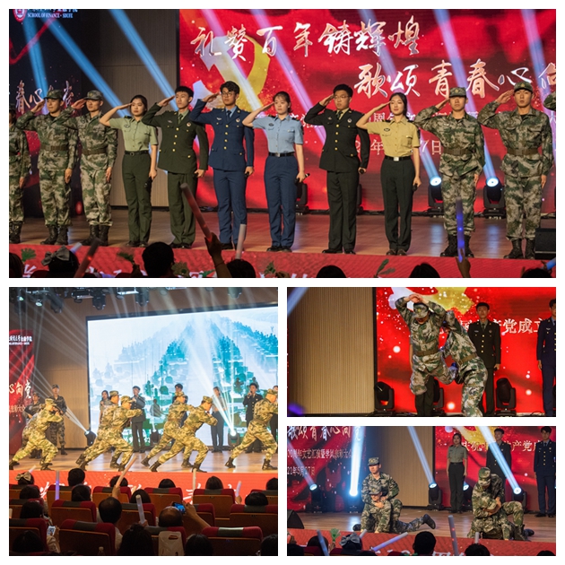 第三篇章,启航新征程。《不忘初心》,我们每个人都有为人民谋幸福、为民族谋复兴的初心;《国韵华彩》,源远流长,彰显着中国文化的自信、博大;《少年中国》展现着青年上九天揽月、下五洋擒蛟的志气风发、意气昂扬;王俊籽老师演唱的《五星红旗》,透露出对祖国无比的自豪与热爱。紧接着,《在灿烂的阳光下》唱响百年的风雨路程,唱响百年的伟大成就,真挚的赞歌,正娓娓道来。活动结尾,全体演职人员倾情献上大合唱《没有共产党就没有新中国》,悠扬浑厚,真挚动人,在场师生激情跟唱,全场气氛在高昂的歌声中再次奔向了高潮。