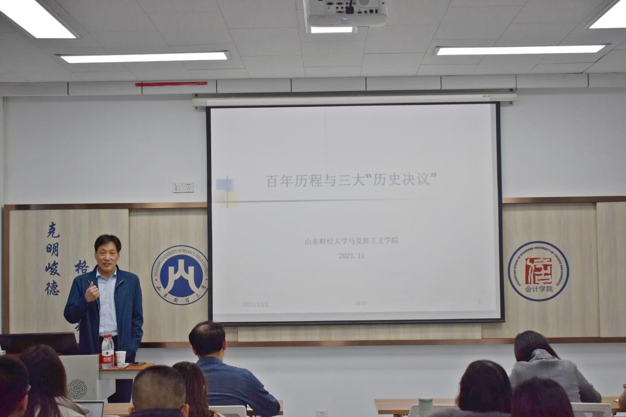 12月2日下午,会计学院邀请马克思主义学院院长沈大光教授作题为“百年历程与三大历史决议”的专题讲座,讲座由会计学院党委书记邵文涛主持,会计学院部分教职工党员和学生党员参加了讲座。