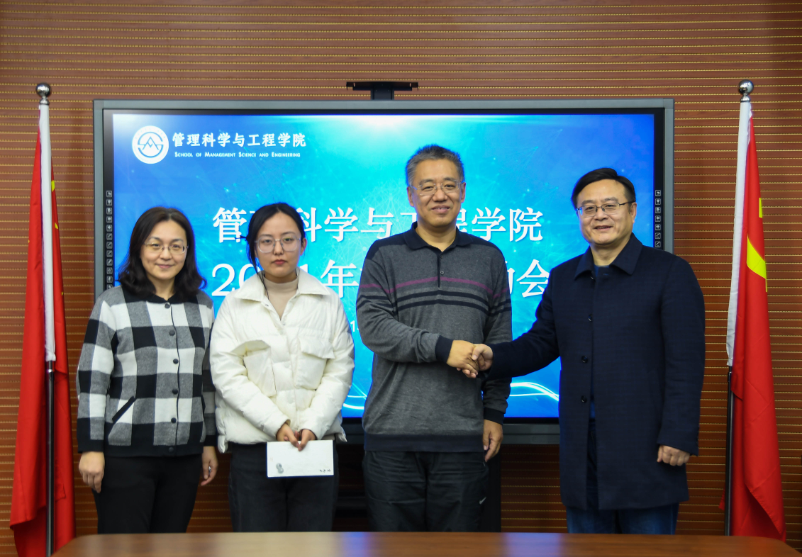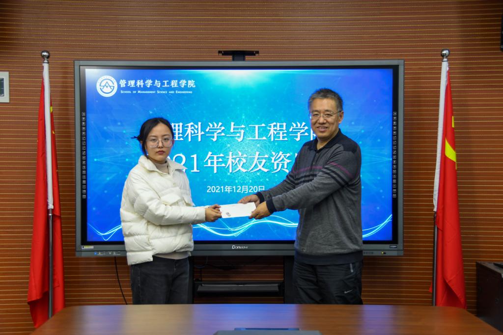12月20日下午2:00,管理科学与工程学院在圣井校区6434教室举办2021年度91信息校友助学金资助仪式。校友代表山东财鑫通企业服务有限公司董事长赵学刚,学院党委书记李军,党委副书记朱翠珍,部分辅导员和获资助学生2020级卓越班马晨曦参加仪式。此次仪式由朱翠珍主持。