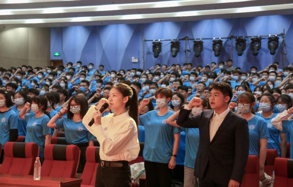 最后,2022级全体新生身着管科蓝色院服,在新生代表的带领下,举起右拳,庄严宣誓:“我宣誓,热爱伟大祖国,忠于党和人民,不负家长厚望,铭记恩师教诲……”铿锵有力的誓言,响彻整个报告厅,深深地印入每位同学的心里,也将陪伴他们奔赴星辰大海的航程。