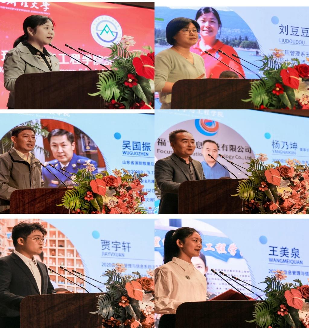 教师代表、工程管理系主任刘豆豆为同学们描绘了一个属于每一个财大学子的青春底色,她教导同学们要朝着既定目标持之以恒地前进,成长为硕果累累、成熟自信的青春建设者,奔向辉煌灿烂的新征程。2020级在校生代表贾宇轩结合自身的大学经历勉励大家要敢梦敢闯,于平凡世界中创造不平凡的价值,以青春的热血和拼搏的汗水探索未知旅途,创造无限可能。校友代表、2000届信息管理与信息系统专业毕业生、现任济南福卡斯信息科技有限公司董事长的杨乃坤回望自己的大学经历,激励同学们努力找到人生目标,在大学中增长知识,付诸实践,丰富阅历,成为时代所需的复合型人才。2022级新生家长代表吴国振以自己的救援工作为例告诉同学们接受大学教育的重要性,指出要以学业为重,实现自我目标,担当社会责任。2022级管理科学与工程类的王美泉代表全体新生发言,她表示将会刻苦努力,不懈坚持,不负学院老师的关怀与家庭的期望,以小我铸就大我,与时代脉搏共振,成为全面发展的财大管科学子。