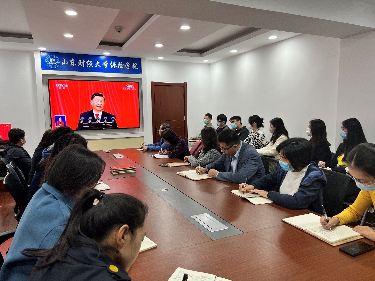 保险学院党委书记张娟表示,保险学院党委将强化党的二十大精神的学习和宣传,进一步凝聚师生力量,把全院师生的思想和行动统一到党的二十大精神上来,在学校党委的正确领导下,探索党建与学院中心工作深度融合的工作机制,发挥党委政治核心作用,紧紧围绕“立德树人”根本任务,牢记“为党育人,为国育才”光荣使命,高度重视“人才强院”,用高质量的工作推动学院向好向上发展,以丰硕的成果助力学校建设发展、服务中华民族伟大复兴。
