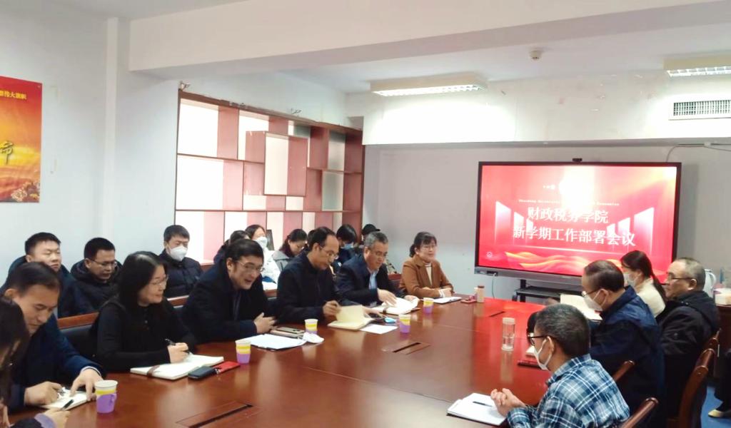 2月14日下午,财政税务学院在办公楼816会议室召开新学期工作部署会议,学院党委书记刘波,院长李森,党委副书记张代宝、滕晖,副院长郭健、赵宝廷出席会议并讲话,学院全体教职员工参加会议。