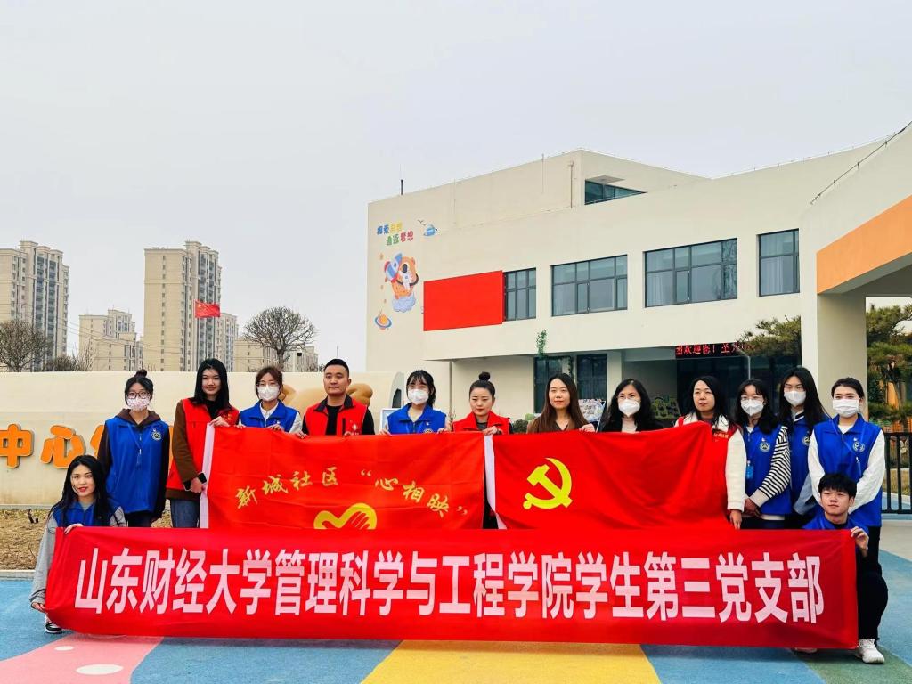 活动开始之前,管理科学与工程学院学生第三党支部与圣井街道新城社区开展“共驻共建交流座谈会”。会上,学生第三党支部书记王桂月介绍了支部的基本情况,支部作为山东省党建工作样板支部,以“七个有力”为目标,不断提升党建质量,争做引领示范,打造真正过硬的样板支部。希望通过与社区联动,达成学校、社区资源共享、优势互补、联动共赢。新城社区副书记赵斐就新城社区党建工作、新城社区特色党建品牌进行了介绍,分享了社校共建的具体思路,并对校社联动提出了期望。