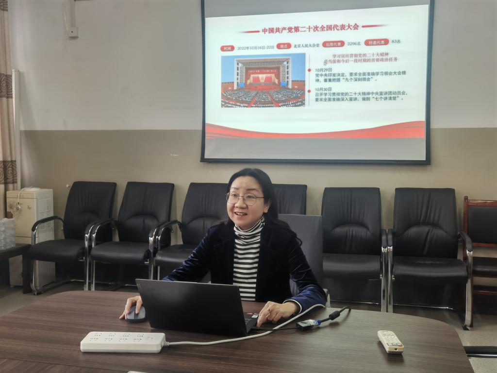 杜丽娜表示,党的二十大报告是我们党团结带领全国各族人民夺取中国特色社会主义新胜利的政治宣言和行动纲领,内涵丰富、底蕴深厚。我们要在全面学习、全面把握、全面落实党的二十大精神上下功夫,要深刻领悟和把握党的二十大精神的丰富内涵和重大意义,自觉用党的二十大精神武装头脑、指导实践、推动工作,使党的二十大精神入脑入心、走深走实,用实际行动将学习党的二十大精神融入到自身的工作中,踔厉奋发、勇毅前行。报告会围绕着党的二十大主题和主要成果、过去5年的工作和新时代10年的伟大变革、马克思主义中国化现代化、中国式现代化、全面建设社会主义现代化国家的目标任务、坚持党的全面领导和全面从严治党、应对风险挑战及教育、科技和人才8个主题展开。杜丽娜号召大家今后要坚持以个人自学、支部会议研讨等多种方式,感受党的二十大精神厚重的政治力量、丰富的思想内涵和强大的实践力量,深思细悟,笃行实干,扎实作风,在真学、真信、真懂、真用上下功夫,切实把学习的实效转化为顽强拼搏的干劲,推动事业发展。