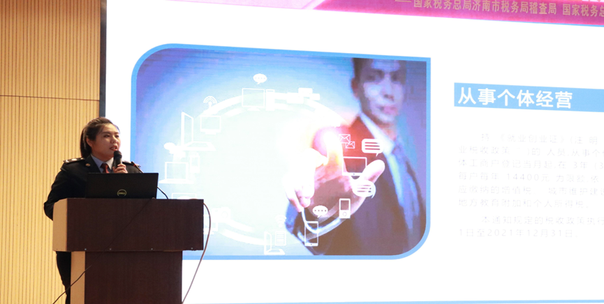 会议伊始,张代宝对济南市税务局稽查局、槐荫区税务局领导干部的到来表达了诚挚的欢迎。乔斐在讲话中谈到,“青年强则国强,青年守法则国家昌明”,希望知税懂税能为学子们的人生路程保驾护航。随后,区局税政一科、社保科代表李琳讲解了大学生就业创业税费优惠政策,她结合自身经历,辅以生动有趣的讲解,引导同学们从生活中了解税收,体会税收,使学子们进一步提高税务素养和创新创业能力变得有迹可循。针对当前大学生被不法分子乘虚而入,市稽查局代表陈尧展开了“珍惜个人信用,远离涉税骗局”为主题的分享,以提高学子们的税法意识和风险意识。他结合自身的工作经历及见闻,普及了冒用身份证信息偷逃税款等涉税违法犯罪行为,深切希望广大学子提高警惕,严格提防涉税风险,保护好个人信息。