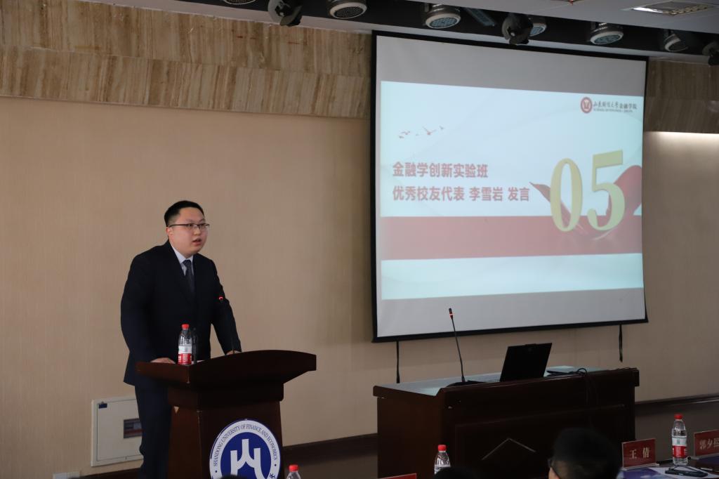优秀校友代表李雪岩感谢母校为金融学子搭建了金融学创新实验班这样一个优良学习平台,结合自己的学习、工作经历鼓励大家珍惜机会和时光,在金融学创新实验班良好的环境中努力钻研、奋发向上。随后,吴红文书记为李雪岩颁发优秀校友证书。金融学创新实验班2023届毕业生代表赵洋、2022级新生代表徐艺欣分别进行了发言。
