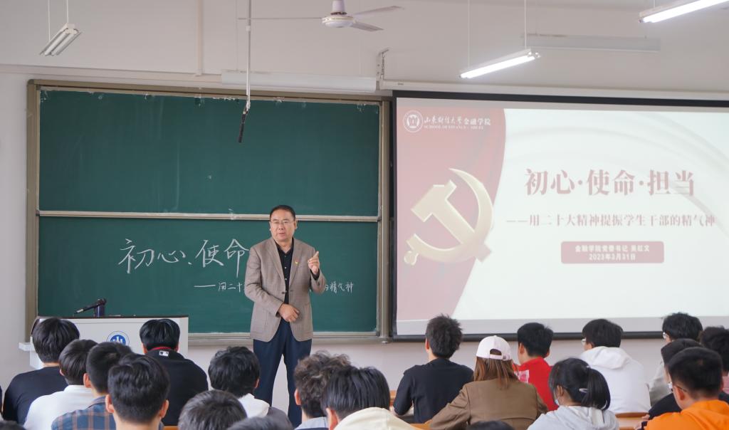为深入学习贯彻党的二十大精神,提高学生干部的思想觉悟,3月31日,金融学院党委书记吴红文在圣井校区做了题为《初心 使命 担当》党的二十大精神宣讲会。金融学院各年级班长、团支书等主要学生干部参加活动。