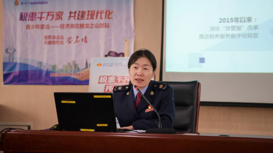 历下区税务局纪检组长、全国税务领军人才王超慧围绕“智慧税务服务中国式现代化的实践探索”进行了学术报告,结合二十余年的税收工作经验,深入浅出地讲解了我国在税务信息化建设上的探索和典型国家税务智慧服务情况,分析了税务智慧服务改革在济南的实践,展望了智慧税务服务助力中国式现代化的愿景蓝图。赵宝廷对报告进行了总结,并对济南市税务局和历下区税务局长期以来对学院的大力支持表示了衷心感谢。