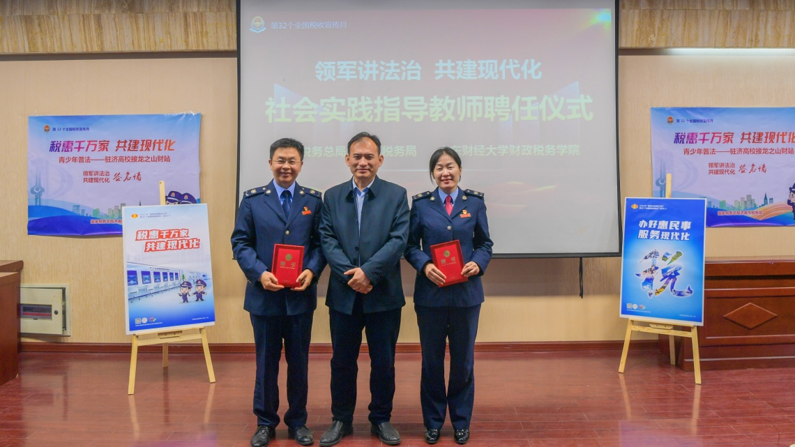 在随后举办的社会实践指导教师聘任仪式上,财政税务学院正式聘请全国税务领军人才王国强和王超慧为社会实践指导教师,赵宝廷为两位导师颁发聘书。