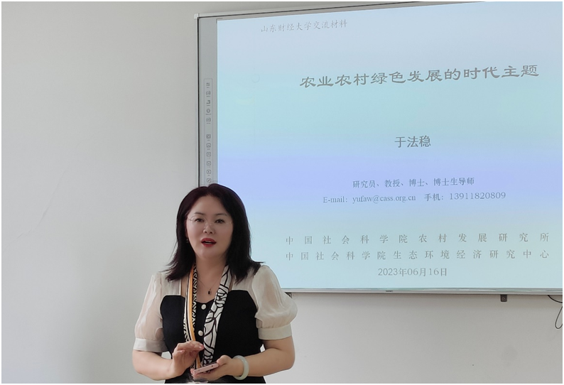 最后,于法稳研究员指出农业高质量发展要遵循绿色发展理念,要以提供安全优质农产品为目标,以生产方式的绿色化为路径,以质量标准化为体系,以国内外两个市场为导向,分析了美丽乡村建设中的理论与现实问题,即谁来建、建什么、如何建、谁组织以及需要什么政策保障,提出了农业高质量发展需处理的重要关系以及相应的对策保障建议,分享了他本人多年全国各地调研的有趣经历。在提问交流环节,师生们踊跃提出自己的疑惑,热情地与于法稳研究员进行学术探讨。