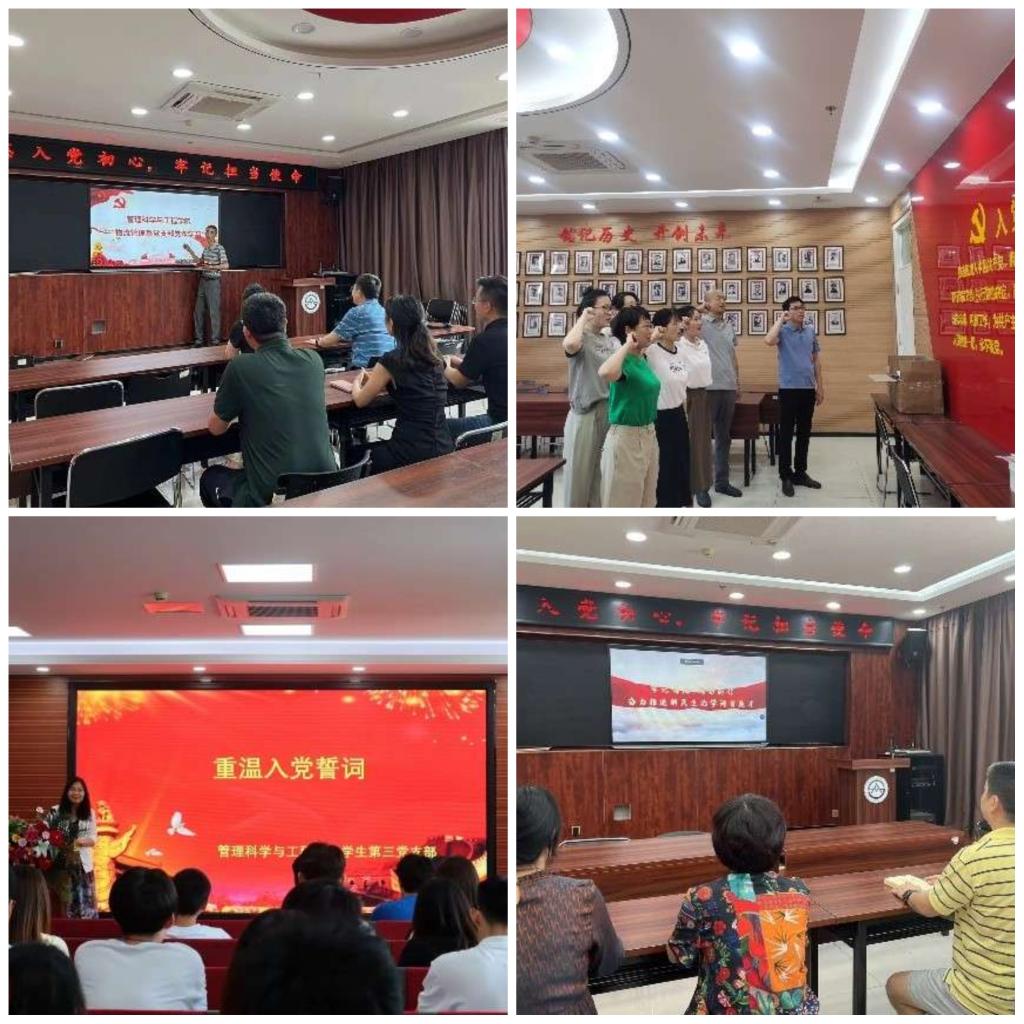 6月28日至7月1日,管科学院师生党支部相续召开党员大会,由支部书记为党员讲授主题教育党课,并重温入党誓词。