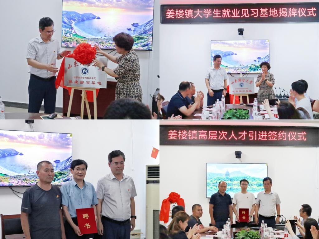 韩慧健代表山东财经大学计算机科学与技术学院,卢勇代表姜楼镇政府签署了人才柔性引进专家协议,并为引进专家颁发聘任证书。杨春丽和卢勇共同为大学生就业见习基地揭牌。