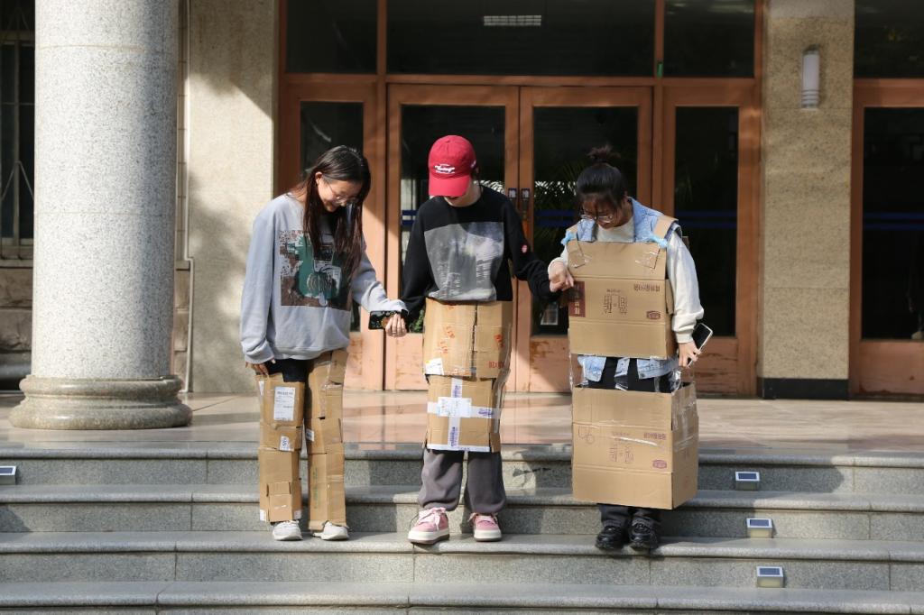 近日,在我校燕山校区,几十名艺术学院学生,穿戴着用废旧纸盒做成的各种阻碍自身行走的装置在校园内蹒跚行走,吸引了多名师生用好奇的眼光驻足观看,其实这是艺术学院独具特色的国际化课程教学内容的一部分,主题为“现象与设计”:同学们在老师的指导下,设计制作并穿戴这些阻碍装置在校园内行走4公里,亲身体验自身被束缚感觉同时,观察路人向自己投来的眼神,充分了解弱势群体尤其是残疾人的行为体验,为自己将无障碍、通用化等设计理念融入设计项目做好铺垫。