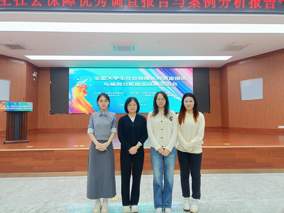 12月9日上午,由中国社会保障学会教学委员会和广西师范大学政治与公共管理学院承办的第二届“全国大学生社会保障优秀调查报告与案例分析报告”成果交流会在广西桂林举行。本届征集活动共收到了来自全国40多所高校共计200余份参赛作品。经中国社会保障学会专家匿名评审,最终产生了23份优秀调查报告和15份优秀案例分析报告。公共管理学院2021级行政管理专业本科生焦凤博作为负责人完成的《打通医养结合的“最后一公里”:养老机构医养结合实施现状及模式创新研究——基于17家医养结合型养老机构的调研》,被评选为社会保障优秀调查报告。指导老师贾海彦、许薇携2021级本科生焦凤博与2022级研究生郭紫曦赴桂林参加成果交流会。