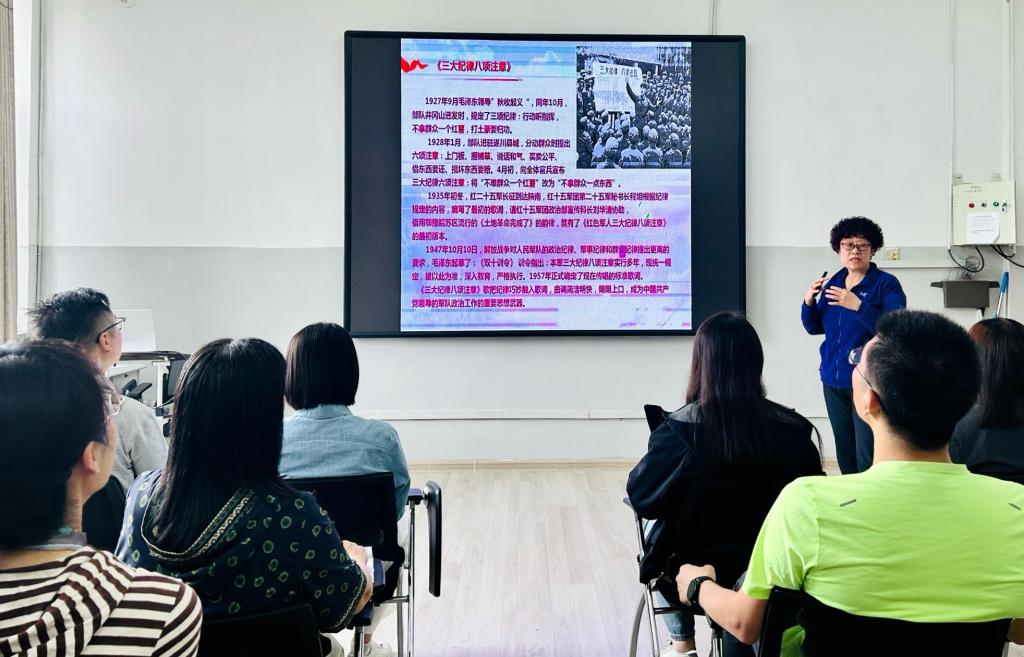 杨春丽结合自身专业特点,通过红色歌曲这一艺术载体,带领大家一起学习了党的纪律建设的历史沿革。中国共产党在建立之初,就把严明纪律作为红色基因深植自身肌体之中,在领导新民主主义革命过程中不断加强纪律建设,并在新中国成立后不断发展和完善纪律建设。在讲到新民主主义革命过程中的党纪建设时,她通过引用红色歌曲《三大纪律 八项注意》向大家做了生动形象的理论阐释。她指出,在领导井冈山斗争的过程中,毛泽东提出了“三大纪律、六项注意”,把铁的纪律作为建军建党的基础。其《三大纪律 八项注意》歌曲的由来和最终形成不仅见证了中国工农红军的战斗历程,更见证了中国人民解放军的纪律建设。