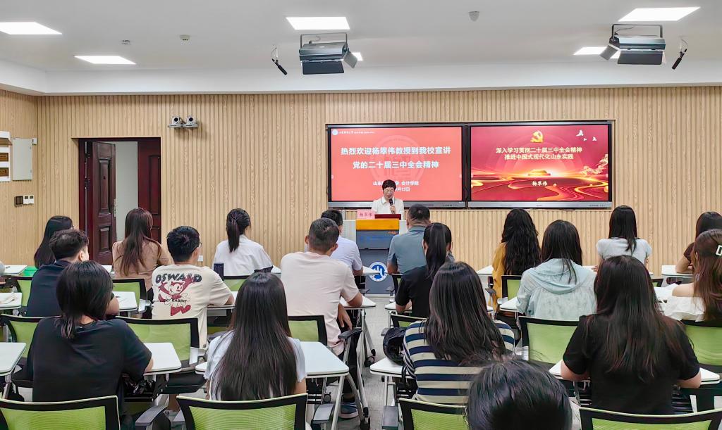 为深入学习宣传贯彻党的二十届三中全会精神,9月13日下午,山东省社会主义学院特聘教授、山东省讲师团宣讲专家杨翠伟教授应邀莅临山东财经大学,以“深入学习贯彻二十届三中全会精神,推进中国式现代化山东实践”为题作专题报告。会计学院党委书记邵文涛、党委副书记郑大伟及研究生参加报告会。