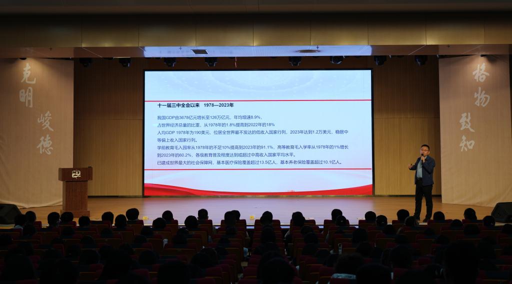 邵文涛紧紧围绕习近平总书记在二十届三中全会上的重要讲话和全会通过的《中共中央关于进一步全面深化改革 推进中国式现代化的决定》,系统展示了自十一届三中全会以来中国经济稳步迅速发展的历程,讲述了中国实现全面脱贫,迈向小康社会的光辉成就。他指出,从党的十一届三中全以来,我们党始终坚持将改革进行到底的坚强决心和历史担当,为推进中国式现代化注入了强大动力。