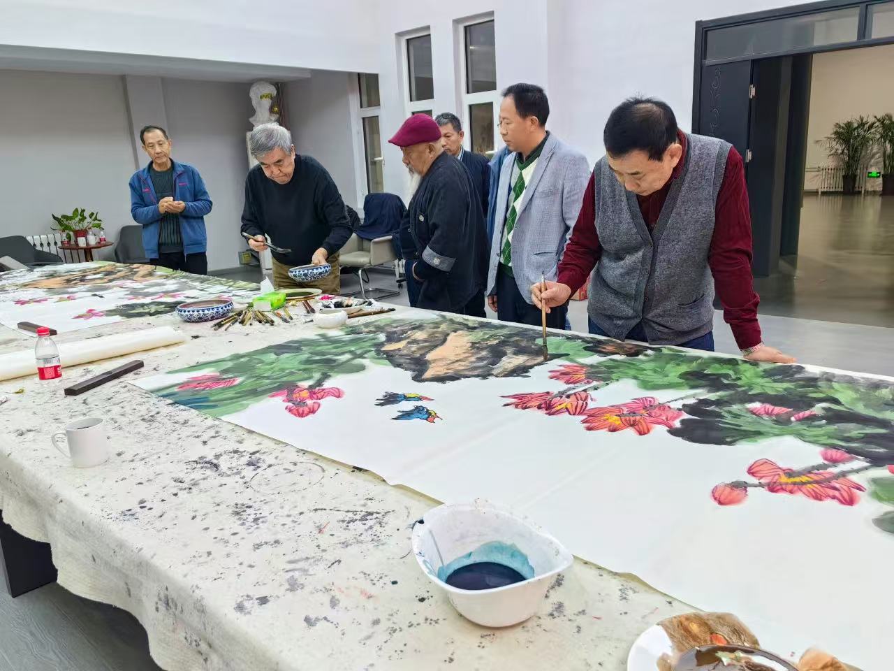 开幕式结束后,参展艺术家挥毫泼墨,现场进行笔会创作,并将集体创作的寓意教育事业蓬勃发展的八尺整张花鸟画作品《盛世和风》捐予海岱美术馆收藏。